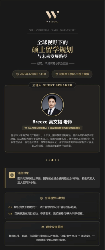本次讲座将围绕“全球视野下的硕士留学与未来发展路径”展开,结合当前国际教育趋势与企业人才需求结构,系统解析硕士留学为何在竞争加剧的时代愈显重要。高老师将基于多年国际教育规划经验,详细介绍中国学生在选择美国、英国、澳大利亚、中国香港等主流留学目的地时需要重点关注的申请要求、选校策略、语言规划、跨文化适应等核心环节。讲座将呈现2017–2024年全球国际学生增长趋势、热门专业变迁、以及各国就业与工签政策的对比解读,并结合真实案例帮助同学理解GPA、语言考试成绩、科研实习、作品集、个人陈述等要素在申请中的权重。此外,高老师将分享其在全球教育与跨国企业工作的第一手经验,解读科技、金融、咨询、工程等行业的国际人才需求,并展示“海外学习→海外实习→回国就业”的路径规划蓝图。讲座旨在帮助同学们清晰定位自身优势,建立长远的学术与职业发展视角。